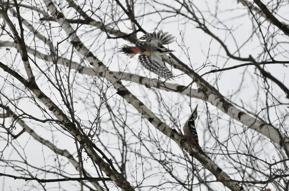 Дятловая романтика с пируэтами: полеты наяву! Пока вы пьёте утренний кофе, в Лосином острове кипят настоящие страсти — у белоспинных дятлов начался брачный сезон! И это не просто «постучал клювом — получил пару», а целое шоу с элементами акробатики. Бравый самец белоспинного дятла решил подойти к делу с размахом. Он взмывает вверх, делает крутой вираж, затем — летит навстречу подруге. Чтобы покорить сердце избранницы самец старается из всех сил барабанить по дереву так, что эхо разносится на весь лес. А еще «белоспинный джентльмен» приносит даме самые сочные личинки — гастрономический комплимент в лучших традициях дикой природы. Время от времени подлетает поближе и трепетно хлопает крыльями. Похоже, тактика работает! Пара уже начала совместно осматривать перспективные дупла — видимо, скоро в Лосином острове появится новое семейное гнёздышко. Если придете в Лосиный остров на экскурсию — прислушайтесь. Возможно, где‑то над головой сейчас разворачивается история большой лесной любви: с пируэтами, барабанной дробью и одной очень впечатлённой белоспинной красавицей. Автор фото: Карина Фоменко.